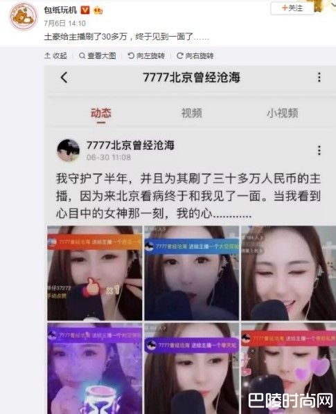 微博用户包纸玩机6日PO出一张截图,昵称为7777北京曾经沧海的网友提到,我守护了半年,并且为其刷了30多万人民币的主播,因为来北京看病终于和我见了一面。当我看到心目中的女神那一刻,我的心……;只见截图中在镜头前皮肤白皙、有着一张V型小脸的女直播主,实际碰面时,脸却变圆了。