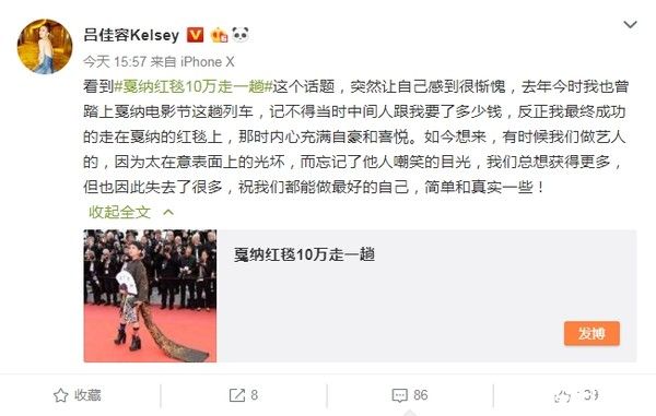 吕佳容坦承自己曾花钱买了一个走上坎城红毯的机会,虽然忘了确切花了多少钱,但最后成功走上红毯也让她开心不已,那时内心充满自豪和喜悦,但再次回想起来,她却感到惭愧:因为太在意表面上的光环,而忘记了其他人嘲笑的目光。希望往后自己能活得更真实、简单一些。