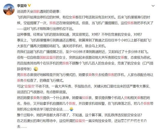 编剧李亚玲在微博发文,称12日在乘坐中国国际航空头等舱时,一位自称监督员的女子怒斥没有及时关手机的乘客,不仅要求提供整个机组人员和乘客个资,还显摆自己认识不少高层。在该监督员的举报下,几名乘客在下机后被迫接受调查滞留了7小时。对此,国航回应称,从未设置监督员职位,也从未聘请任何外部人员担任监督员。