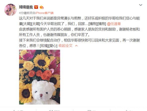 当天,任达华透过微博发文,写下4字报平安:我们回家。老婆琦琦也同步发文感叹,这几天对于我们来说都是异常漫长与煎熬,还好乐观积极的华哥给我们信心与能量,今天华哥出院了,我们,回家…。