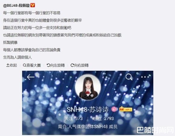 不久后,竟被网友发现SNH48根本没有苏诗诗这名成员,而且大头贴还是盗用了姐妹团BEJ48成员段艺璇的照片,段艺璇本人也将这名冒牌成员的帐号页面截图下来,发文表示:请这位无聊的网友,别带着我的头像,冒充我们成员或粉丝给自己加戏,抵制网暴,每个人都应该学会为自己的言论负责,生而为人请做个人。 公开与冒名的网友划清界线。