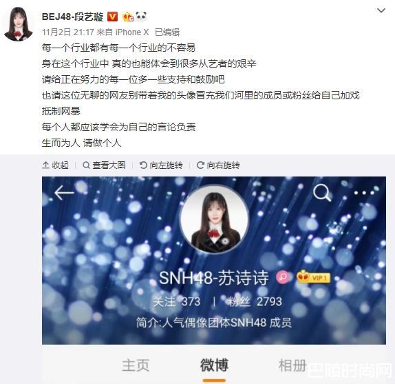 后来,段艺璇发现照片遭盗用后,立刻在微博发表声明,提到每一个行业都有每一个行业的不容易,身在这个行业中,真的也能体会到很多从艺者的艰辛,请给正在努力的每一位多一些支持和鼓励吧,也请这位无聊的网友,别带着我的头像冒充我们河里的成员或粉丝给自己加戏,抵制网暴,每个人都应该学会为自己的言论负责,生而为人,请做个人。