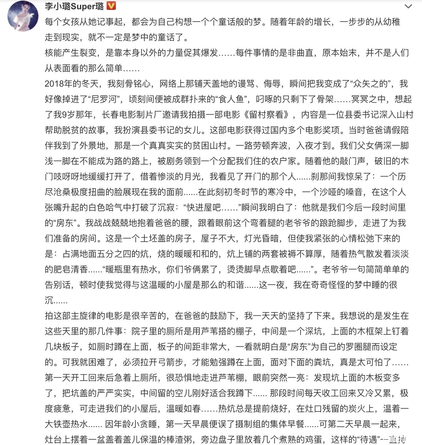 然而在偷拍影片被有心人士恶意曝光后,李小璐也绝望的表示:而我却被推送到了生命的最后边缘、2018年的冬天是寒冷的,我有多少次站在高层住家的窗前,眺望窗外远处的蓝天,心想:如果从这里融入那个世界,也许一切都释然了,言词间透露出过去曾动过想轻生的念头,但因为女儿的呼喊才让她又回来,然而即便李小璐出面致歉,仍有许多网友在该篇贴文下进行攻击。