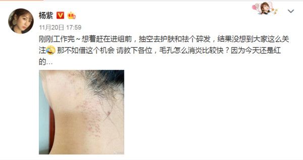 不过杨紫亲自回应传闻,她表示只是想要赶在进剧组前,抽空去护肤并且去除碎发,结果没想到大众这么关注,她索性趁这个机会,拍了后颈去除碎发后的红色痕迹问广大的网友,请教一下各位,毛孔怎么消炎比较快?因为今天还是红的...。
