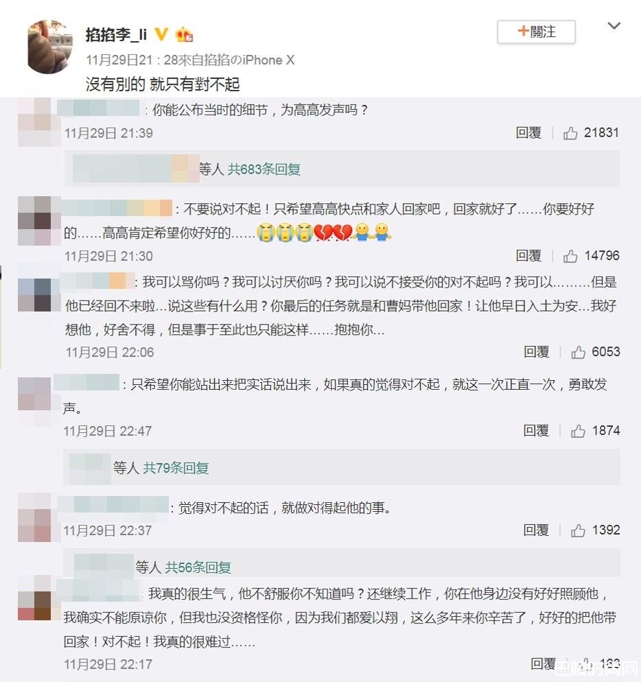 在这篇发文底下,涌入多位粉丝留言,有人说不接受道歉,他不舒服难道你不知道、他已经回不来了,说这些有什么用?也有人希望他能公布事发当下的细节为高以翔发声,另外的网友则安慰他,不要说对不起,只希望高高(高以翔)早点回家,高高也希望你好好的。