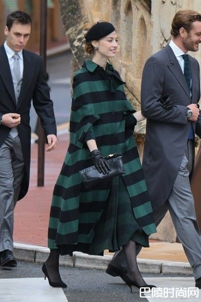 摩纳哥王妃Beatrice Borromeo,这位原出身意大利贵族世家的美丽名媛,不仅当过模特儿,登上过意大利VOGUE杂志的封面,还是曾是于各大新闻社撰稿的专任记者,近期现身国庆大典,一身绿黑格纹斗篷,配上黑色蕾丝网帽,搭配简单的黑色手拿包与高跟鞋,充满气质又高雅的打扮获得赞许。