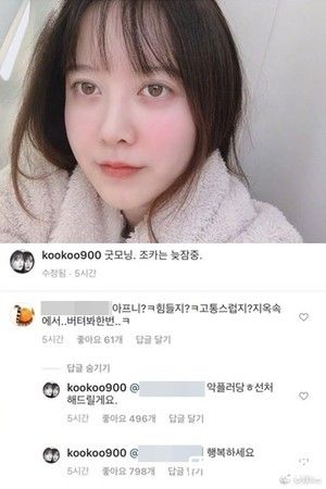 具惠善7日在IG晒出数张自拍照,并写下:早安,姪子正在睡懒觉。不料随后竟有网友留下恶评说道:疼吗?累吗?痛苦吗?妳也试着在地狱中撑看看吧!她不久后也回覆恶评党,这次饶了你,祝你幸福,高EQ的回应吸引少人为她加油打气。
