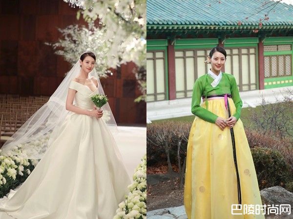 秀贤昨在首尔举办婚宴,她身穿纯白礼服,深V设计从锁骨大露到胸口,丰满上围仿佛快要掉出来,头发梳得俐落披上白纱,显得十分有气质。而另外一套则是穿上传统韩服,绿黄搭配十分活泼,和老公在韩屋前面拍摄,她在IG写下在结婚当天穿韩服是我的梦想,谢谢让我梦想成真。