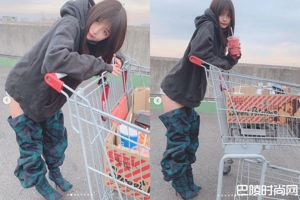 景井ひな在大卖场中推着推车,身穿黑色宽松帽T,原以为她要走下身失踪穿搭,但往下看绿格子裤子竟脱到一半!