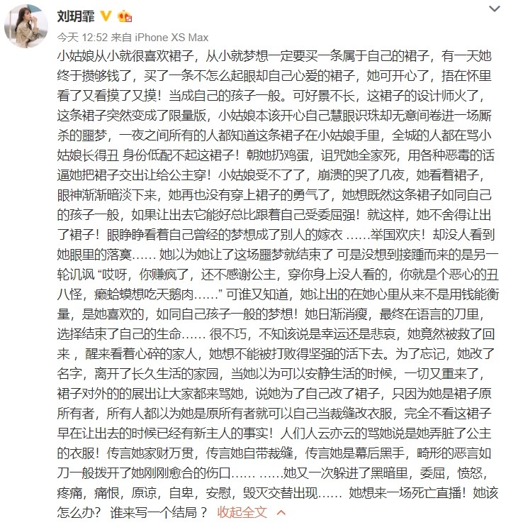 刘玥霏28日在微博发文,分享一个小姑娘的故事:她从小就梦想买一条自己的裙子,好不容易存够了钱,买下一件不起眼的裙子,自己非常喜欢。谁料设计师突然爆红,她的裙子成了名贵限量版,全城的人都骂小姑娘配不上这件衣服,骂到她又哭又崩溃,最后失去穿它的勇气,决定把这条裙子让出去给公主穿。