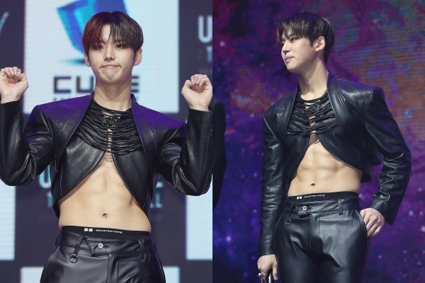 PENTAGON在12日举办首张正规专辑《Universe: The Black Hall 》回归SHOWCASE,成员们展现出更成熟的暗黑魅力,成员洪硕更是穿起短版背心,露出六块腹肌和马甲线。就连成员们在现场都不断CUE洪硕的衣服,比出请拍的手势。