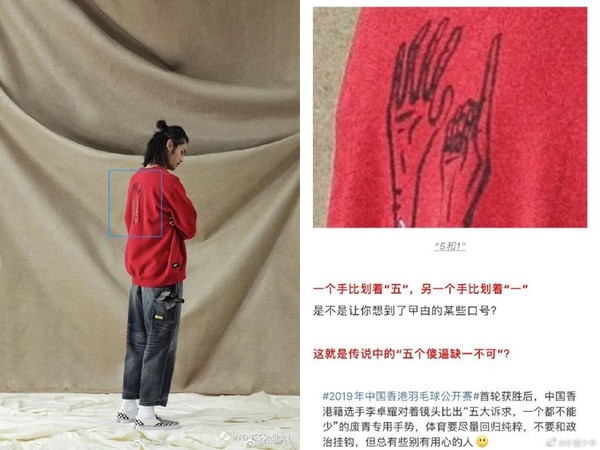 余文乐品牌发表新款服饰,其中一件红色上衣,背面出现5、1手势,引发大陆网友联想香港抗议口号五大诉求缺一不可,受到批评滚出大陆、取关是一定的了,抱歉。对此品牌官方微博发表声明:被误解及恶意抹黑之图案设计出自美国著名插画师之手笔,概念单纯代表着余文乐『No.6/6六叔之称号,并没有其他意思……。