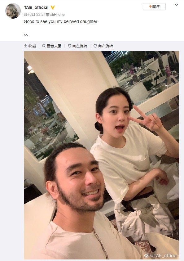最新晒出的照片中,TAE和欧阳娜娜都身穿白色上衣,对着镜头俏皮比YA,他蓄着落腮胡相当有型,而且身材已经消瘦不少。他在贴文写道:开心见到我的干女儿。同时据粉丝透露,他在台湾发展时,认欧阳娜娜当自己的干女儿,上星期干女儿从波士顿飞到泰国去探望,两人才会破次元同框,也让网友惊讶竟然认识、以为看错了、第一次羡慕欧阳娜娜、这俩怎么看都不像父女辈的。