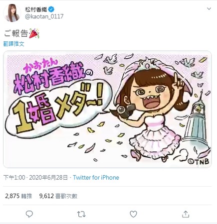 日本女团SKE48前成员松村香织2018年随团在名古屋开演唱会时,闪电宣布毕业,当时令不少粉丝感到相当错愕。在2019年5月正式退团后,她依然经常透过社群与粉丝互动,殊不知28日竟无预警透过推特宣布了婚讯,且对象为圈外人,引起了热议。