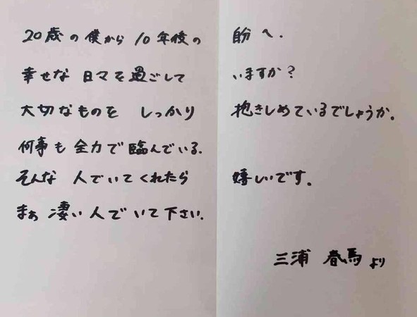三浦春马曾在20岁发行的写真集《Switch》中,写信给10年后、30岁的自己。他亲笔写道:20岁的我写给10年后的自己。现在的你是否过着幸福的日子呢?有好好地拥抱那些珍贵的事物吧。如果你还是对任何事都全力以赴,那样就太好了,请继续成为强大的人吧。三浦春马