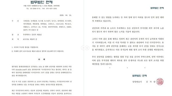 此外,公司透露,就在珉娥方面确定不接受警方调查后,论坛DC INSIDE AOA GALLERY上,依然有部分人士散播虚假事实诬陷珉娥,导致她的症状持续恶化,公司在意识到严重性后,目前已经决定先向一名恶意诬陷的网友提告,对其他人的处置也会持续进行,更强调在诉讼过程中将彻底查明他们诬陷的内容并非事实,也喊话请停止诬陷行为。