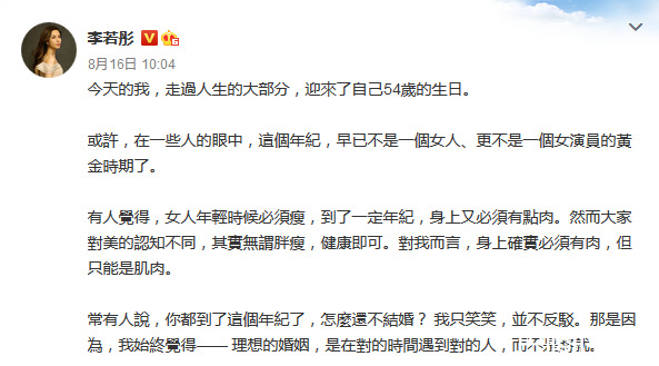 李若彤不老的传说讲咗好年,冇结婚冇生仔慨渠,突然仙气回归幕前,个样冇乜变,身材仲结实过以前,半点脂肪都搵唔到,虽然渠系早年娱乐圈出产慨美女,但竟然冇人计算到渠慨实际年龄。近年李若彤开始喺社交网活跃,好似上咗瘾咁狂post女神相,又分享健美修身心得,8月16日生日慨渠,公开话畀大家知渠已经54岁,keep得好年龄根本唔重要,最近佢仲密密搵人仔,疫情啱啱先话有缓和迹象,渠索性长期喺内地打趸,吸够金先走。