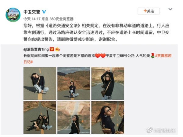 贾青日前在微博晒出了一组在公路上的美照,照片中可看到她坐在没有车的公路正中间,还写下长假期间跟闺蜜来个闺蜜游是个不错的选择,宁夏中卫66号公路,大气的美,没想到不久后宁夏中卫市公安局交通警察局的官方微博转发了此篇贴文,警告此举已违法行人应靠右侧通行,通过马路应确认安全迅速通过,不应在道路上长时间逗留,中卫交警向你提出警告,请删除微博减少影响,引发了热议。