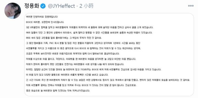 而昨天(24日) 晚上,队长郑容和在twitter 上传长篇文章,叙述着关于续约、将回归心情,并感谢BOICE 一直在身边。