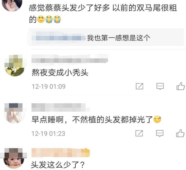 有不少网友发觉蔡萝莉的头发似乎和先前发量厚实的马尾相比稀疏了不少,隐隐露出白色的头皮,除此之外,不少人也发觉她的鼻子和嘴唇也变得不太一样,质疑她似乎又去做了新的微整形手术,引发热议,感觉蔡蔡的头发少了好多,已前的双马尾很粗的。、早点睡啊,不然植的头发都掉光了。、头发这么少了?