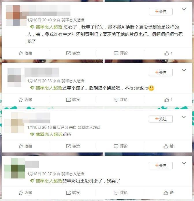 然而郑爽被爆美国找代理孕母生娃,加上不签字导致两个孩子无法回大陆,张恒顾孩子滞留美国,疑似弃养举动遭到各界炮轰。《翡翠恋人》原本复播有望,如今女神形象重创,众人担忧又无法播出,讨论区(超话)留言翡翠奶奶更没机会了,我哭了,更有网友提议不然打上马赛克 ,官方集资换脸吧、后期搞个换脸吧,不行cut也行、建议AI换脸,想看李钟硕。