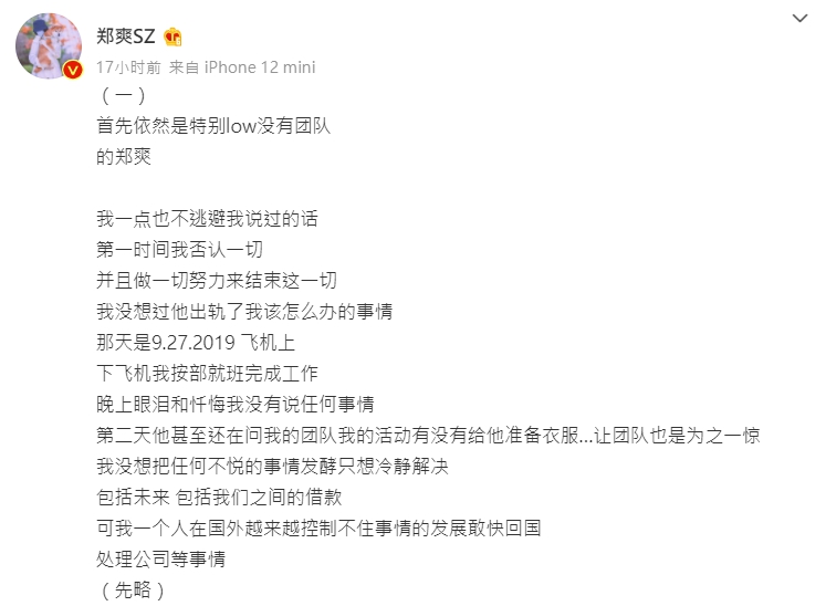 郑爽在19日晚间再度发布两则贴文回应,表示不逃避自己说过的话,她表示自己发现张恒出轨之后虽然按部就班完成工作,但晚上眼泪和忏悔我没有说任何事情,然而张恒被她发现出轨之后仍然试图继续参与她的工作,为此她决定先回国处理一切事情,她表示录音是张恒爸妈来找他们道歉,并且转交了张恒的护照,帐面原有的400万也逐渐亏空,让她一度连房租都付不出来,郑爽透露自己年轻就想多攒点钱,存款投资收租金,后来没有团队帮忙打理,便自己一个人扛下一切。