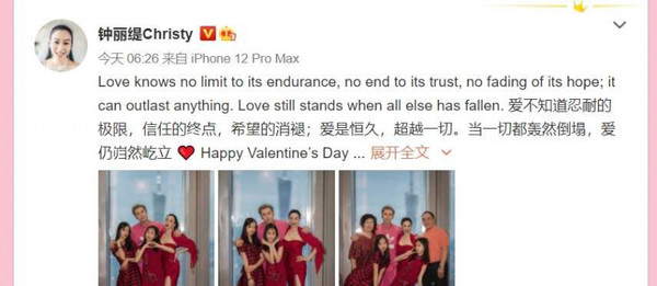 钟丽缇今日上午6点多就发文写下一段心灵鸡汤,爱不知道忍耐的极限、信任的终点、希望的消退;爱是恒久,超越一切。当一切都轰然倒塌,爱仍岿然毅力。情人节快乐。字里行间似乎是在阐述自己和家人的爱,不过这些年来她和小12岁的老公张伦硕婚变传言不断,真人秀节目中似乎连婆婆都对她不好。