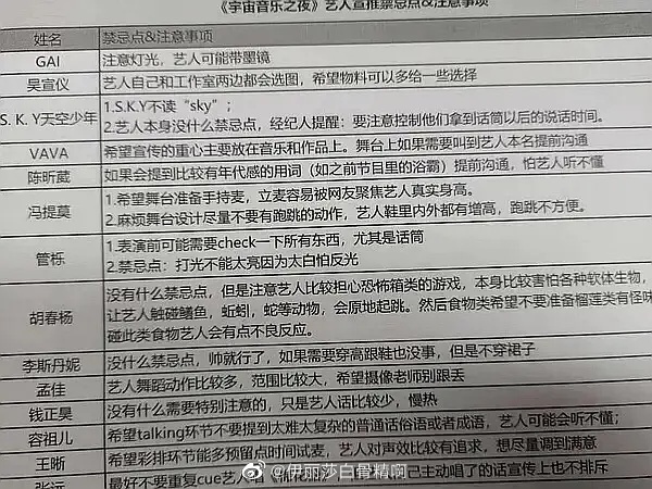 除此之外,清单中也列出不少其他艺人的禁忌点,包括GAI由于大多戴墨镜,因此要节目组特别注意舞台打光;VAVA要求节目组不能擅自cue到她的本名;孟佳由于舞蹈动作又多范围又大,希望跟拍摄影师不要跟丢等,引发网友热烈讨论。