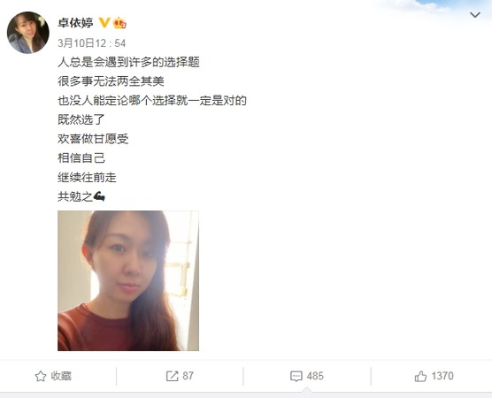 现年39岁的卓依婷,已于2016年结婚,并生下一个女儿,歌唱事业转战大陆,以及东南亚等地,尽管已经升格当妈妈,仍然保有童颜外型,以及甜美嗓音,并有铁粉追随多年,时常透过微博更新近况。而她最新一则贴文写道:人总是会遇到许多的选择题,很多事无法两全其美,也没人能定论哪个选择就一定是对的,既然选了,欢喜做甘愿受,相信自己,继续往前走,共勉之。