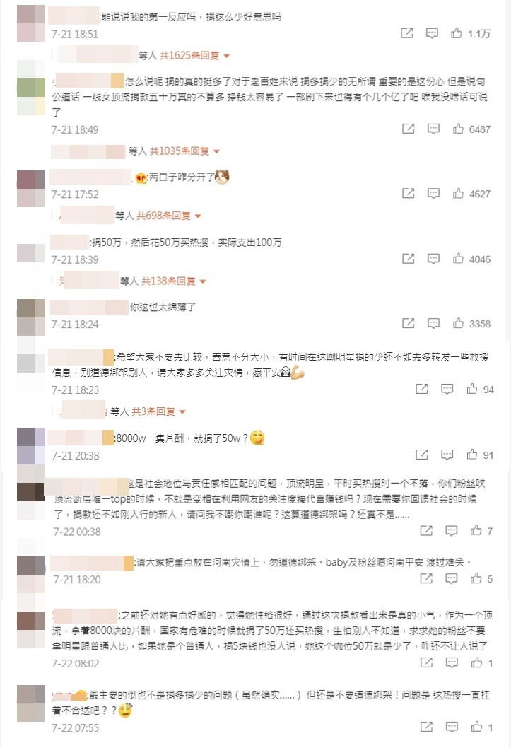 河南暴雨成灾,尤其郑州降雨量突破历史纪录,各地传出严重灾情,演艺圈明星抛砖引玉,纷纷捐款援助,女星Angelababy(杨颖)就捐出50万人民币,但却被网友炮轰捐太少,在网路上掀起讨论。