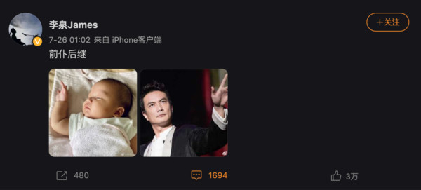 就在上个月26日的深夜,李泉无预警在微博上PO了一张婴儿和自己表演时的照片,有趣的是,婴儿睡觉时的手势和他的手势一模一样,他还写:前仆后继。立刻被网友猜出他是在官宣自己当爸爸了,由于他向来对自己的私人生活相当低调,连是否结婚、孩子的妈妈身份、孩子何时出生、性别都没透露,因此让粉丝十分惊喜,连歌手好友丁薇也直呼:哟,这保密功夫,恭喜!孩子是否也能替李泉带来得奖好运,就待周六典礼开奖。