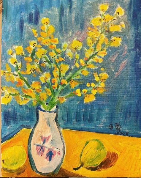炎亚纶22日在整理东西时,意外发现自己1999年的绘画作品,随手拍下PO到Instagram和网友分享。从照片中可以看到,桌面上摆着一个白色花瓶,里头插了束黄色类似文心兰的花卉,一旁则散落几颗水果,在蓝色背景衬托下相当显眼,花瓣混用橘、黄2色,描绘深浅花纹变化,整体非常生动。