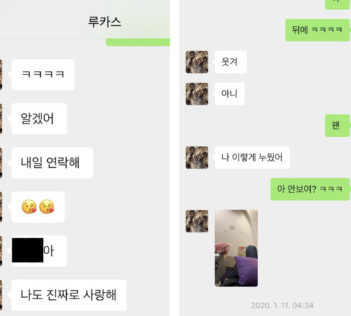 爆料者再爆,因为自己真的很喜欢Lucas,两人交往期间,她也从没没有叫男生与她合照,甚至连偷拍照片都没有,然而,最近Lucas去中国活动,又开始回头找她,大约是在1个月前,她警告男方再这样我要告你,Lucas马上就退出Kakaotalk还换了号码。