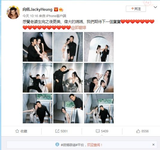 向佐15日在微博发文,PO出多张和郭碧婷的恩爱照片,只见两人一下牵手甜笑,一下做出各种搞怪动作,模样俏皮可爱,写道:感觉老婆生完之后更美、伟大的妈妈、我们期待下一个宝宝!还附上超多颗爱心图案,而其中一张照片他则是从身后环抱护住郭碧婷肚子,动作引起猜测。