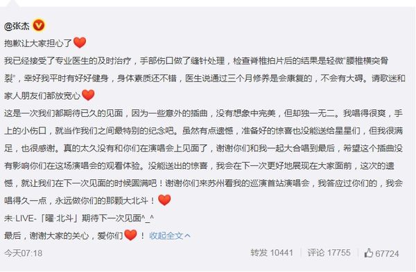 张杰也在微博发文安慰粉丝,开头就向粉丝道歉,让人相当心疼也不舍,接着他表示:幸好我平时有好好健身,身体素质还不错,医生说通过三个月修养是会康复的,不会有大碍。但无法将演出完美呈现,让向来敬业的他坦言实在有些遗憾。