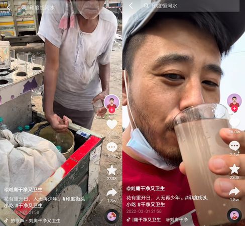 抖音网红刘庸长住印度,经常分享当地的文化及饮食,在抖音拥有996万粉丝、Bilibili拥有326万粉丝,他1月疑似因喝恒河水确诊,然而猎奇作风非但没有掉粉,反而大涨200万粉丝。痊愈后的他,日前也再度去到恒河,并喝下一杯污水柠檬汁,引网友直说你是真不怕啊。