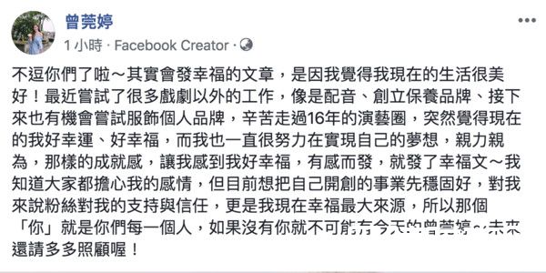 不过原来36岁的曾莞婷会笑得这么灿烂,真正想告白的对象并不是神秘的另一半,而是最珍贵的粉丝们,她29日早上解释会发如此幸福的文,是因为最近的生活真的很美好,除了乡土剧的演出,又挑战了个人保养品牌和电影配音,未来也有计划推出服装品牌,辛苦走过16年的演艺圈,现在的成就让自己感到又幸运又快乐,而这些的来源就是每一个支持者,最后感性告白:如果没有你就不可能有今天的曾莞婷~未来还请多多照顾喔!