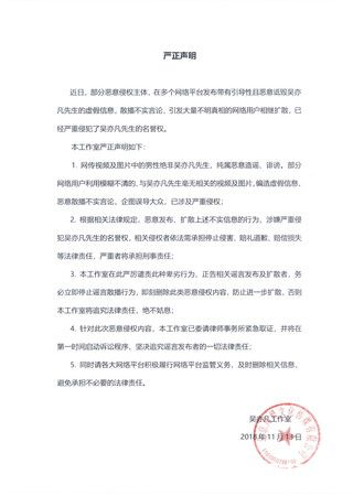 影片中,一名神似吴亦凡的男子坐在地上,被另名短裙辣妹俯身压制,直接送上香唇热吻,全程都被录下,影片曝光立刻在网路掀起骚动。夜店多名工作人员接受《新京报》访问,也证实他近期内确实曾现身该店,并透露:他一般在包间里玩,让舆论急速发酵。本人立刻透过工作室发表声明,强调影片男子绝对不是吴亦凡,是有心人士恶意传播,以涉及严重侵犯名誉,将对散布者提出告诉,绝不姑息,也呼吁大众不要再疯传相关影片。