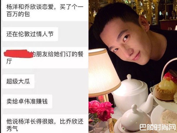 网友2月爆料,称在伦敦偶遇杨洋和一名女子逛街,后来发现该名女子正是乔欣,两人当时还买了一个价值百万的名牌包包,还去某间餐厅一起吃饭过情人节。不过双方都否认传闻,男方经纪人表示:没有的事,怎么可能,他们同学这么多年了,要好早好了。