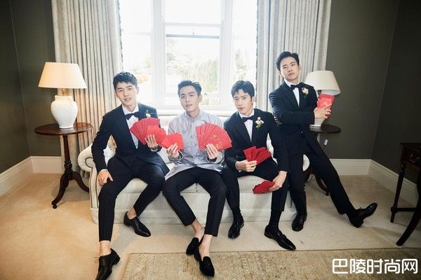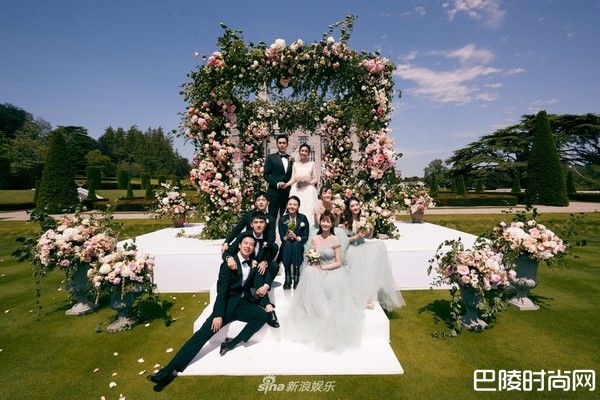 婚礼当天张若昀夫妇也和伴郎、伴娘、司仪合影留念,宋茜、李沁、沉梦辰站在新娘这侧,由宋茜拉起新娘的头纱,伴郎刘昊然、井柏然、郭麒麟则在新郎这边,刘昊然双手拉着张若昀一只手,而马思纯则在最后拖着郭麒麟的脚,手上捧着井柏然帮忙抢到的捧花,画面逗趣又不失浪漫。