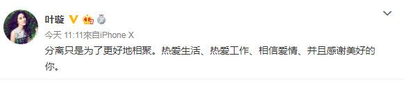 叶璇18日也在微博上发文,再度回应分手一事,分离是为了更好地相聚。热爱生活、热爱工作、热爱爱情,并且感谢美好的你。不少粉丝也纷纷在底下留言鼓励, 加油,我们一直都在、希望您能放下这段感情,努力地往前走、每段经历都是独一无二的,经历过,放得下,重头来过就好。