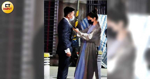 王心凌不顾旁人目光,大方地在路边帮蓝蔚文整理衣服。