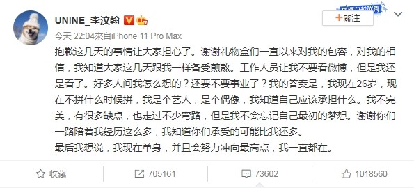 李汶翰为绯闻骚动向大家道歉,也感谢粉丝对自己的包容,坦言这几天心情备受煎熬,遭批评还要不要事业了?他回答我现在26岁,现在不拼什么时候拼,我是个艺人,是个偶像,我知道自己应该承担什么。同时也表示自己并不完美,有很多缺点,但是不会忘记最初的梦想,最后强调我现在单身,并且会努力冲向最高点,我一直都在。