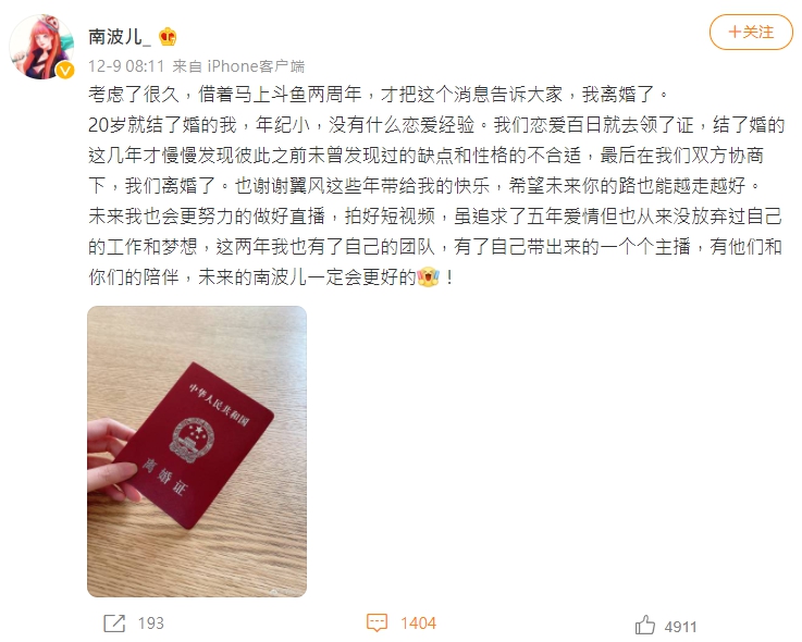 南波儿在微博发文透露,自己考虑了很久才决定向大家宣布自己的离婚消息,对当初仓促结婚的决定表示:20岁就结了婚的我,年纪小,没有什么恋爱经验。她透露当时才不过坠入爱河一百多天就去领证结婚,之后才慢慢发现彼此之前味曾发现过的缺点和性格的不合适,因此决定离婚。她对前夫表达由衷的感谢并祝福,同时承诺未来会专注于直播和拍短片。