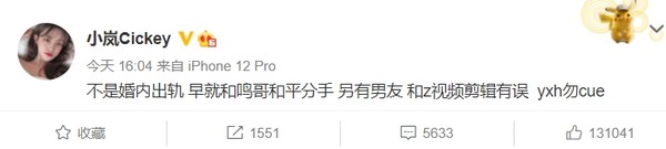 令网友惊愕的是,尽管朱星杰公开承认恋情,但王岚随后发文,依然跟男方说法不一:不是婚内出轨,早就和鸣哥和平分手,另有男友,视频剪辑有误。不只否认跟朱星杰交往,还爆出自己有其他交往对象,让不少网友傻眼哗然,但双方目前都未进一步解释,关系令大众雾里看花。