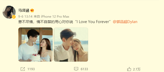 两人认识3年,但其实直到去年下半年才确定关系。戏杀青后断断续续联系,彼此都发现放不下对方,总是想着对方。直到今年郭品超下定决心,过去总是住在剧组饭店的他,不但在北京买了预售屋,也先租了房子,让两个人可以在一起,也一改过去极度保护恋情隐私习性,选在马泽涵生日当天13点14分公开恋情。