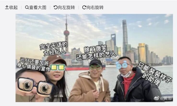 对此,黄渤也发文诙谐回应了爆料,黄渤在文中感谢同事们多年的齐心协力之外,也曝光一张照片,表示江边留个影,愿大家新的一年一如既往心存善良,目向远方,而照片中,除了黄渤头上标注了除了微笑还能怎样的明星之外,另外三名工作人员也纷纷被标注完全无语的女经纪人、元旦要加班的宣传、只能装装样子的助理,澄清了出轨疑云。