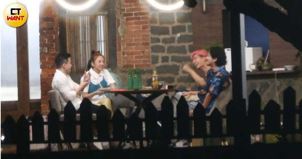 众人边吃边聊,鬼鬼拿着手机给身边的人看,庹宗康边吃边帮身旁的伙伴倒酒,吃吃喝喝、气氛颇佳,不时可见此起彼落的笑语。六点四十七分,大伙吃吃喝喝告一段落,鬼鬼离开桌子独自走到一旁的摇椅躺下滑手机,其他人也是时而聚着聊天,时而处理自个儿的事情,处理好了又回到桌子边喝一杯。八点多,染了一头桃红色醒目发色的炎亚纶与助理交谈了几句后,直接拿着绿色瓶身的饮料对嘴大口畅饮。