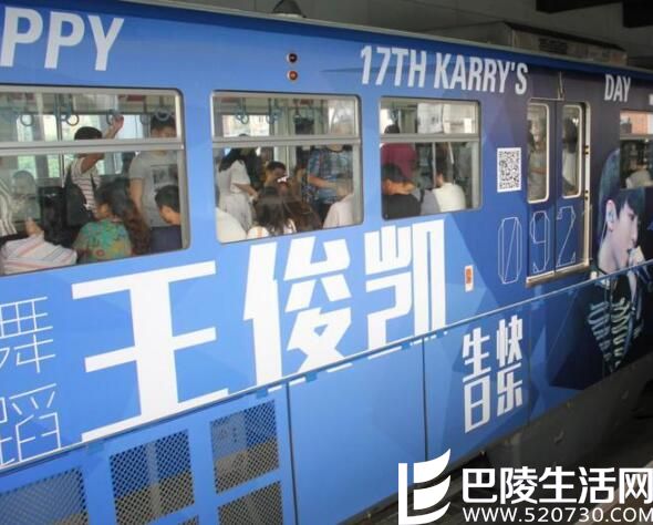 2016年9月13日,重庆,TFBOYS成员王俊凯即将在9月21日迎来自己17岁的生日,而粉丝们也开始各种应援,其中一项就是在王俊凯的家乡的轻轨列车上,包了一条线的广告。据了解,这次TFBOYS粉丝包的轻轨是重庆的3号线,是重庆轨道交通线网中最繁忙的路线,时间跨度是9月11日-10月15日。车身全被粉刷成了王俊凯生日快乐的主题广告。不少市民乘客感慨,这些粉丝太有钱了,全车应援还是最长的3号线,不知道要多少钱。经记者多方打听到,终于联系上包下3号线轻轨为王俊凯庆生的粉丝,该粉丝是一位80后的重餐饮公司的老总,今年27岁,他一直是TFBOYS成员王俊凯的铁杆粉丝,知道王俊凯即将在9月21日迎来自己17岁的生日,为了给王俊凯庆生,专门为王俊凯包了一条重庆最长的3号线的广告,包下这条轻轨3号线的广告费大约花费1000万。