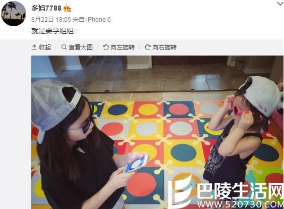 8月22日,孙莉在微博中晒出两个女儿的近照,照片中,多多穿着黑衣短裤,戴着黑超反戴着帽子,十分有型,而妹妹也跟姐姐一样的打扮。孙莉发文称:“就是要学姐姐”。